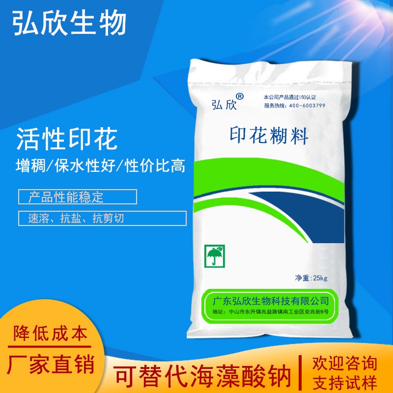 弘欣印花糊料是采用创新工艺和技术设备,经过不断调整和优化制作的环保型活性糊料。不仅快速溶解,糊液细腻透明,过网性好,脱糊性优良,分散性、抱水性、耐碱性和稳定性都非常高,克服了传统海藻糊料得色量低、鲜艳度不够、原糊保存时间短等缺点,且性价比突出。